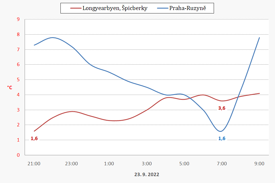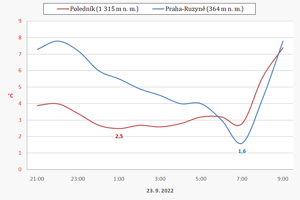 Do mrazivějšího rána než na Sněžce se probudili v Ústí nad Orlicí, kde naměřili -0,7 °C a kde díky tomu prožili nejmrazivější 23. září za poslední desítky let, přesněji první mrazivé 23. září od roku 1961. Bylo pokořeno 0,8 °C z roku 2016. Dále pak 1,4 °C z roku 2012, 1,5 °C z roku 1997 nebo 1,9 °C z roku 1973. Historické tabulky málem přepisovali i v Přibyslavi. Tam byla naměřena o 0,5 °C vyšší teplota než před 52 lety, tedy 0,2 °C. Na ruzyňském letišti sice byla větší zima než na Poledníku, ale minimum 1,5 °C z roku 1970 odolalo, třebaže těsně (chyběly dvě desetiny stupně Celsia). 23. září 1970 nebylo ohroženo ani v severočeské metropoli, kam přineslo 0,4 °C. 23. září 2022 bylo o 1,3 °C teplejší. V Prostějově stejně jako v Ústí neodolalo minimum z roku 2016, v tomto případě 2,5 °C.