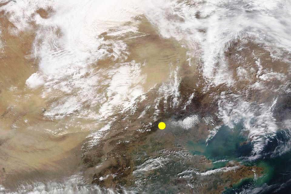 PÍSEČNÁ BOUŘE Z POHLEDU DRUŽICE TERRA VE ČTVRTEK 15. DUBNA (KRÁTCE PŘED DOSAŽENÍM PEKINGU) | ZDROJ: NASA