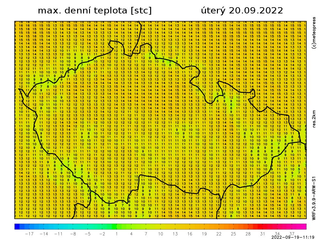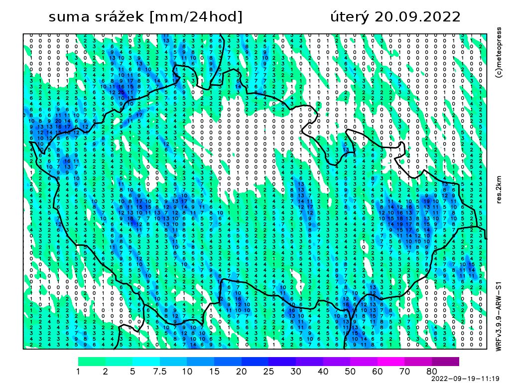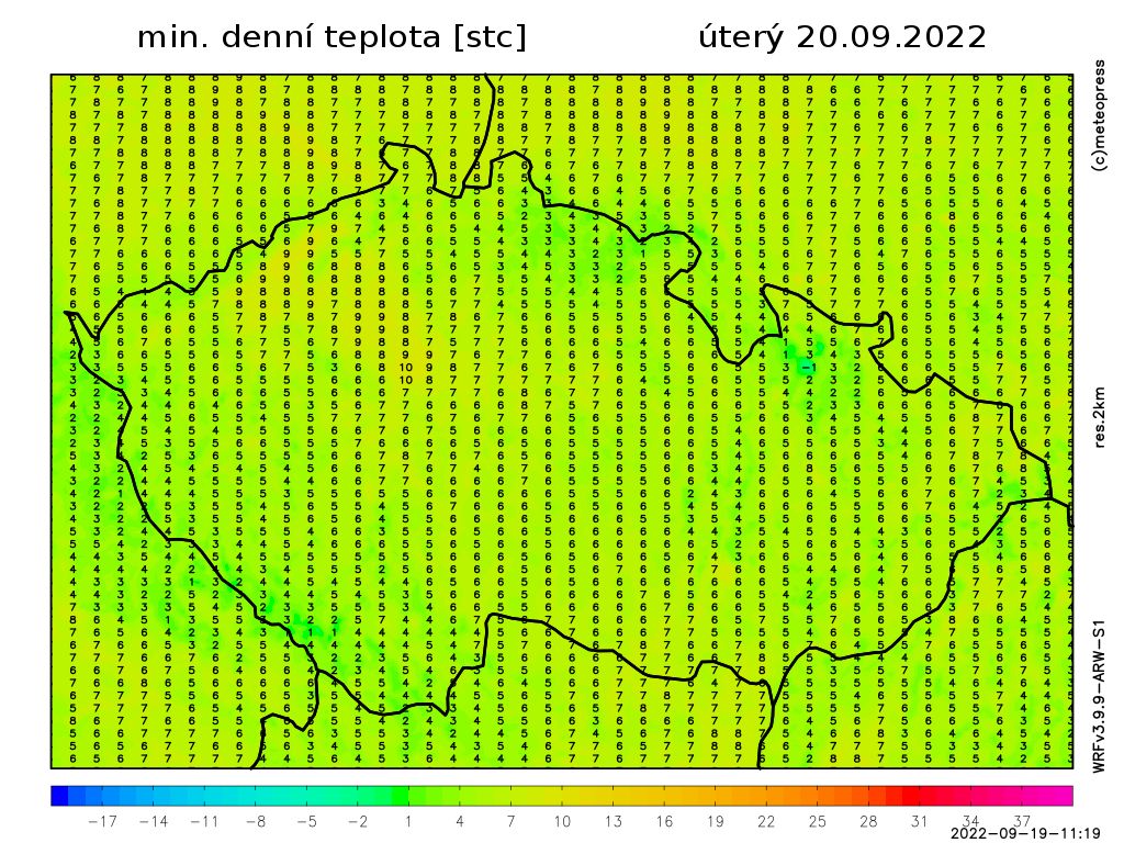 Bude tak zataženo až oblačno, na většině území s deštěm a přeháňkami. Ty budou pouze v nejvyšších polohách nad 1400 m n. m. v Krkonoších a v Jeseníkách smíšené nebo sněhové.