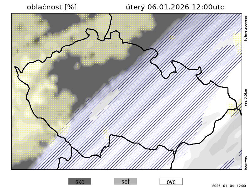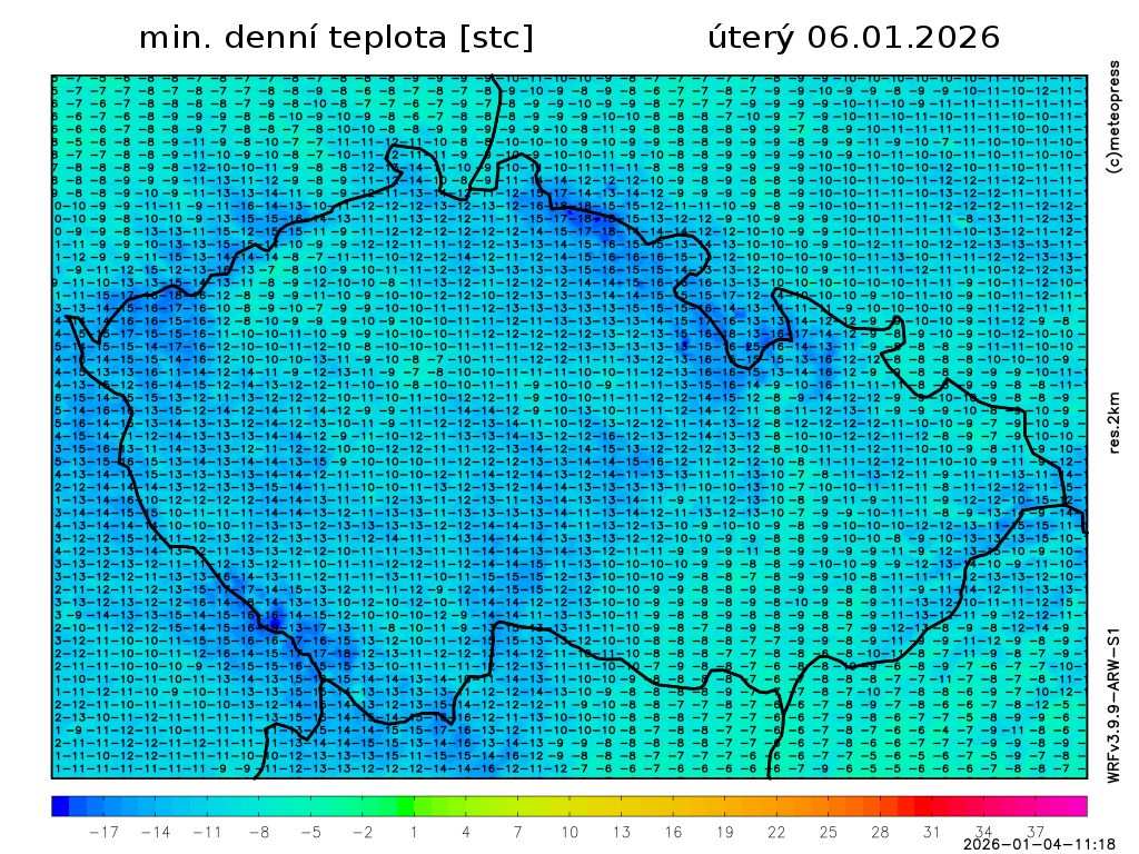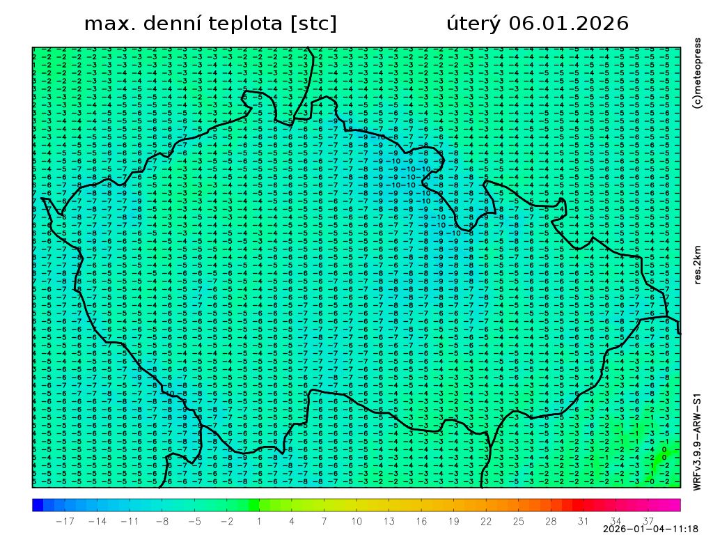 Nejvyšší denní teploty vyšplhají na -6 až -2 °C, teplota v 1000 m na horách kolem -8 °C. Foukat bude slabý až mírný vítr severních směrů.
