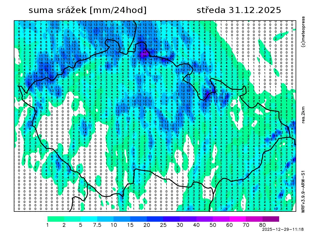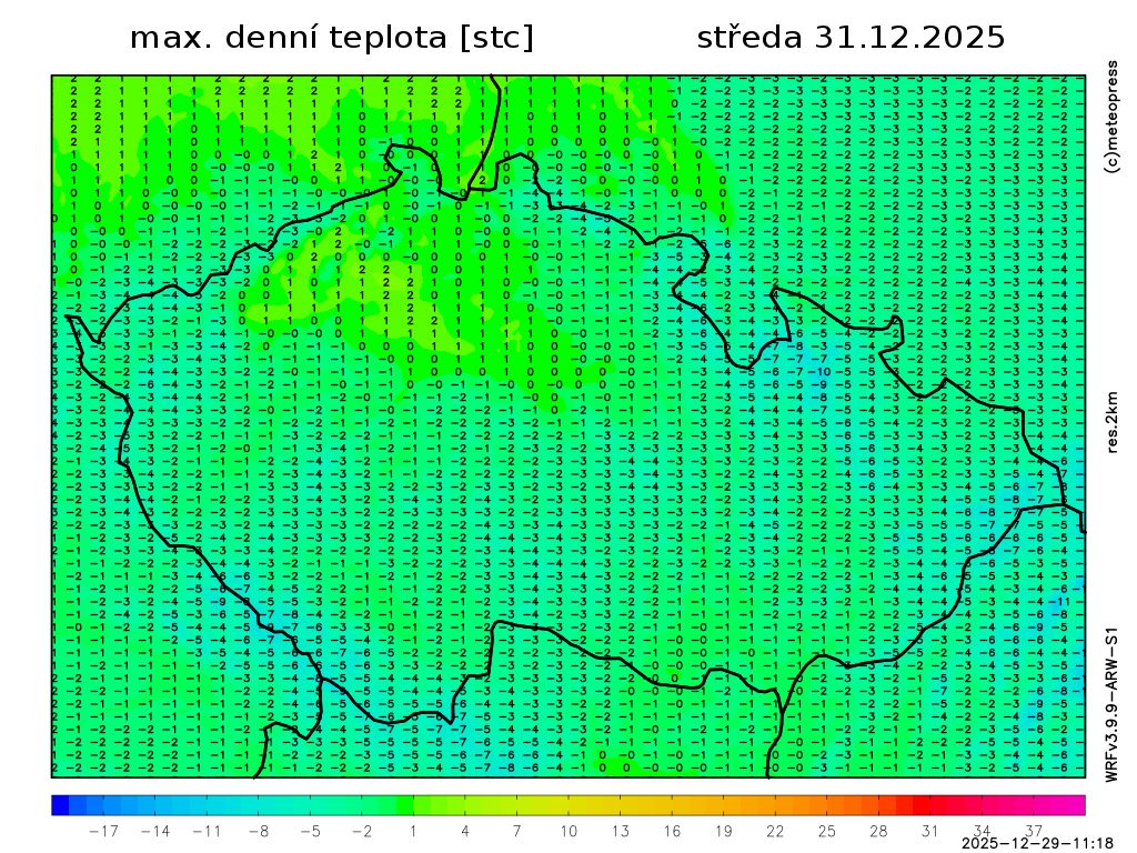 Nejvyšší denní teploty -3 až 1 °C. Teplota v 1000 m na horách kolem -6 °C. Mírný až čerstvý vítr západních směrů.