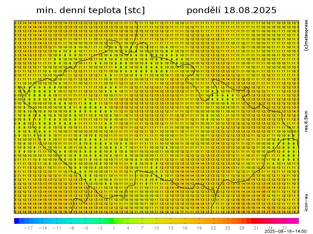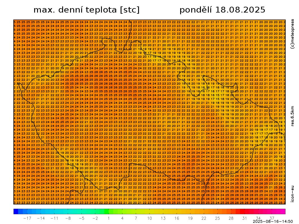 Nejvyšší denní teploty vystoupí na 22 až 26 °C. Teplota v 1000 m na horách kolem 18 °C. Foukat bude slabý až mírný severovýchodní vítr.