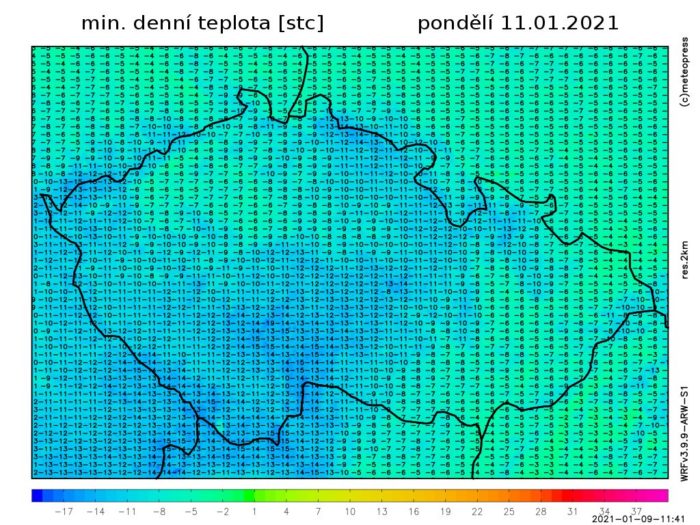 Nejnižší teploty budou díky zmenšené oblačnosti oproti minulým dnům nižší, naměříme -8 až -13 °C, na východě a ve středních Čechách místy kolem -6 °C.