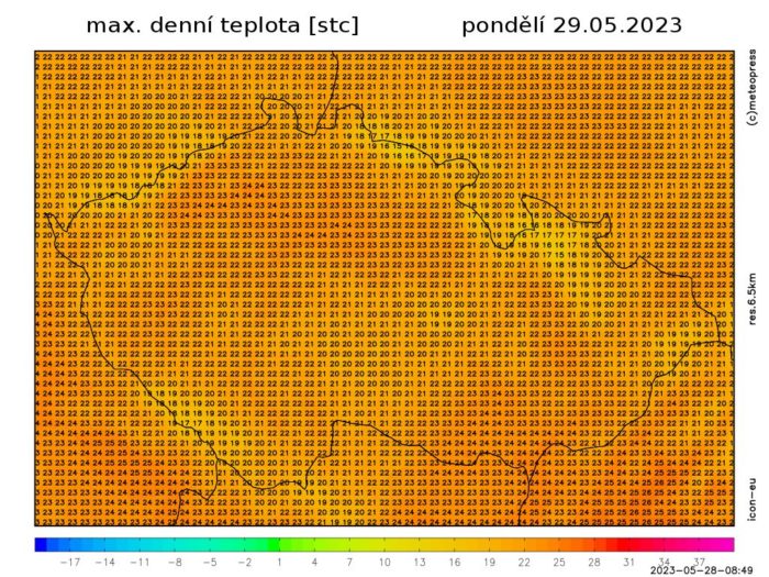 Nejvyšší denní teploty 21 až 25 °C. Teplota v 1000 m na horách kolem 16 °C. Foukat bude slabý až mírný severovýchodní vítr.
