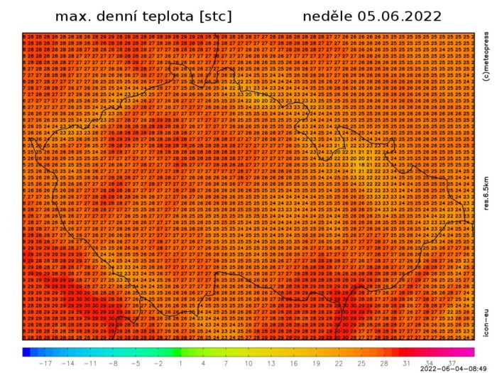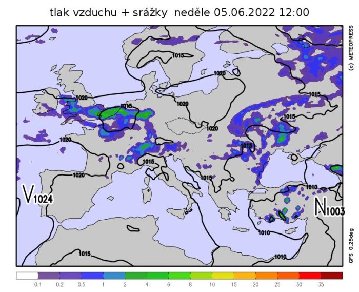 Počasí ve střední Evropě bude v neděli ovlivňovat mělká tlaková níže se středem nad Beneluxem, okolo které k nám bude proudit teplejší vzduch od jihu. Večer počasí ovlivní studená fronta postupující od západu. Po většinu dne tak očekáváme jasnou až polojasnou oblohu. Zatahovat se začne k večeru od západu a později se na jihozápadě přidají přeháňky a bouřky. Ty mohou být i silné, doprovázené zejména přívalovými srážkami s úhrny až kolem 50 mm a silnými nárazy větru. Teploty vyšplhají většinou nad 25 °C.