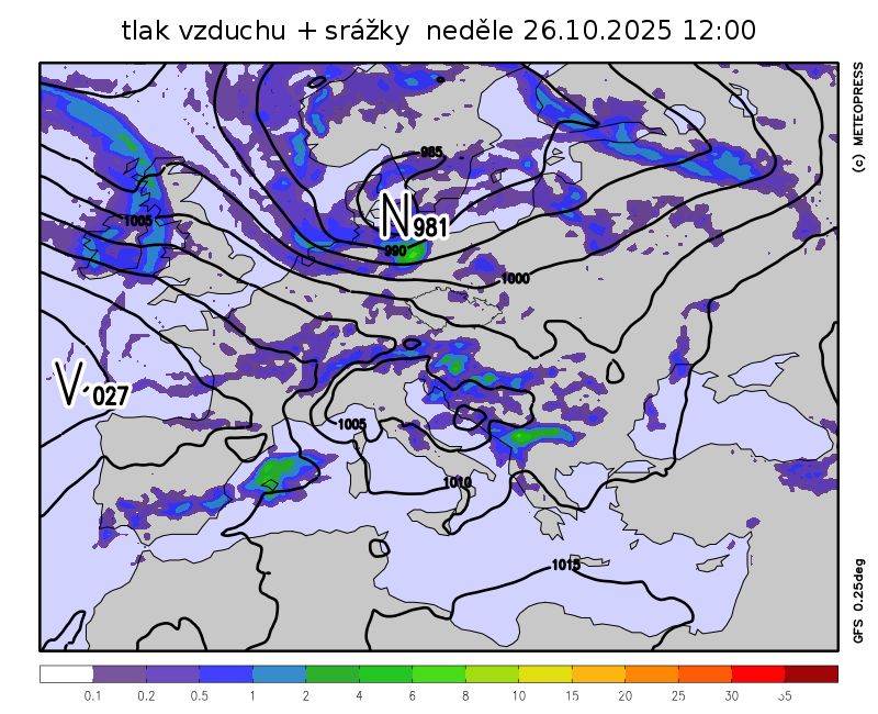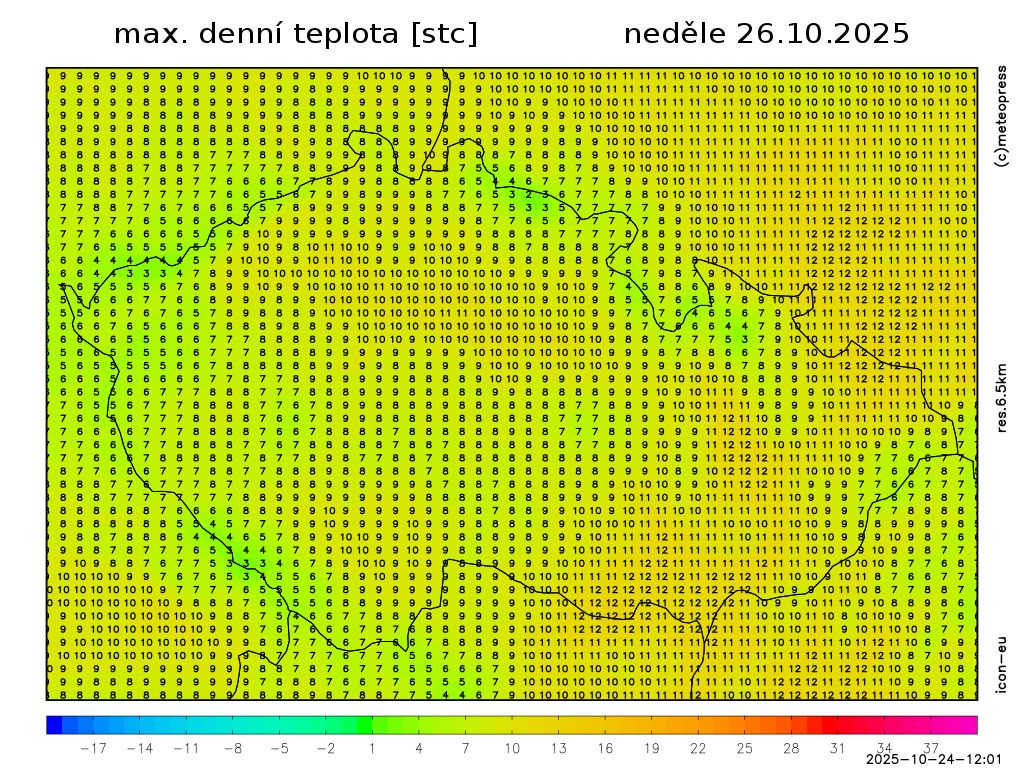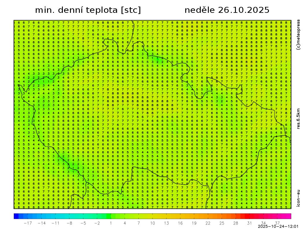 V neděli bude polojasno až oblačno, přechodně až zataženo a místy déšť nebo přeháňky, odpoledne na severu četnější. Nad 1000 m, přechodně už nad 700 m sněžení.