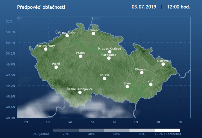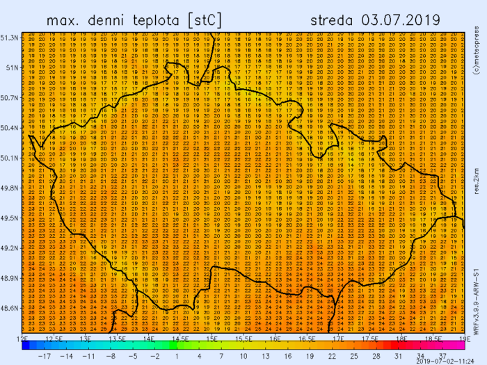 Předpověď maximální teploty vzduchu ve 2 m na středu 3.7.2019