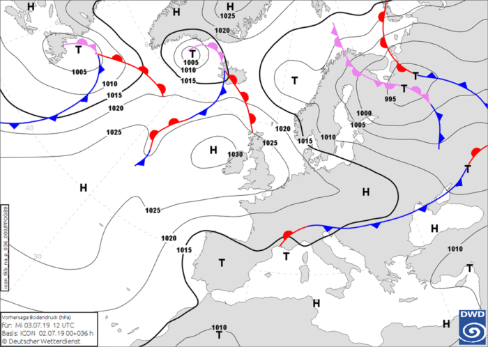 Předpověď synoptické situace na středu 3.7.2019 (Zdroj: wetterzentrale.de)