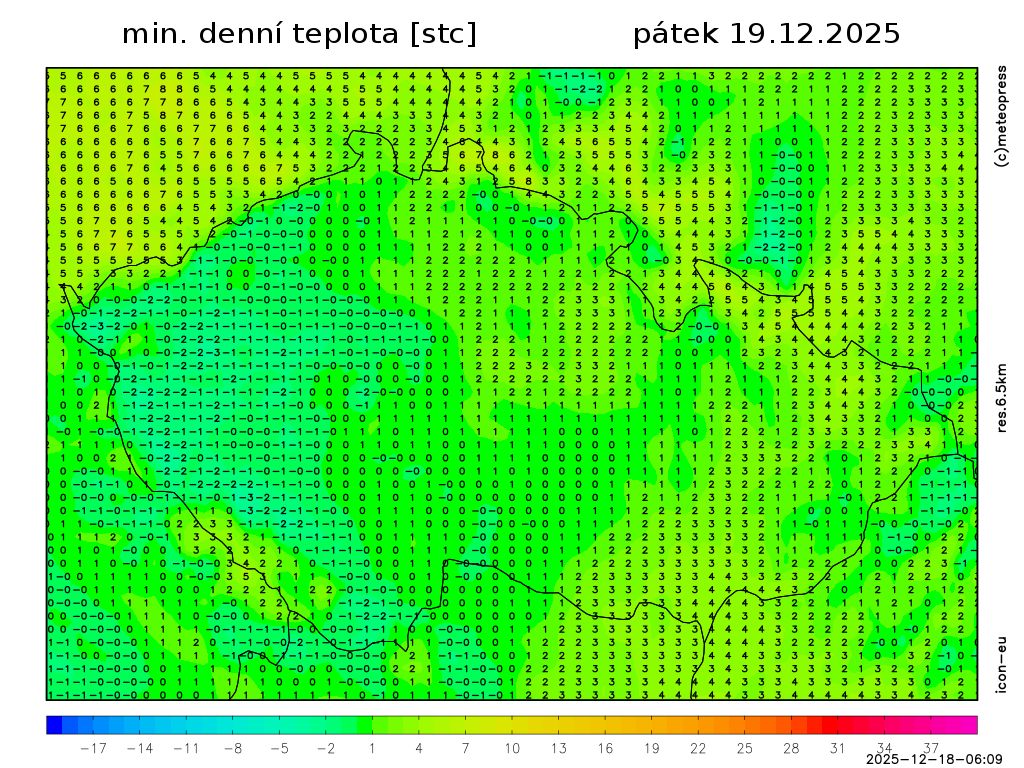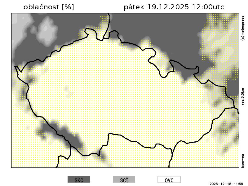Ojediněle polojasno, zejména ve Slezsku. Ranní teploty 3 až -3 °C.