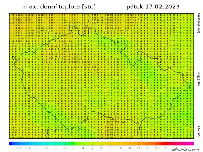 Nejvyšší denní teploty 6 až 11 °C. Teplota v 1000 m na horách bude kolem 4 °C. Vát bude mírný až čerstvý jihozápadní až západní vítr, místy s nárazy 50 až 70 km/h.