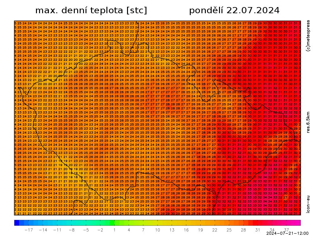 Nejvyšší denní teploty 23 až 28 °C, na východě 28 až 32 °C. Teplota v 1000 m na horách kolem 18 °C, na východě až 24 °C. Foukat bude slabý až mírný severozápadní vítr.