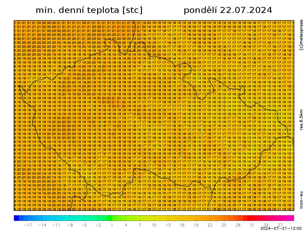 Bude polojasno až oblačno, na východě zpočátku skoro jasno. Od západu na většině území déšť nebo přeháňky, místy bouřky. Večer od západu ubývání oblačnosti. Bouřky mohou doprovodit zejéna přívalové srážky s úhrny kolem 40 mm, v menší míře nárazy větru kolem 60 km/h a kroupy do 2 cm. Ranní teploty 19 až 14 °C.