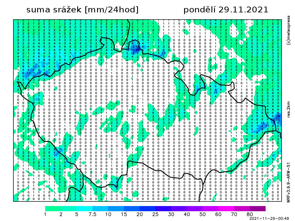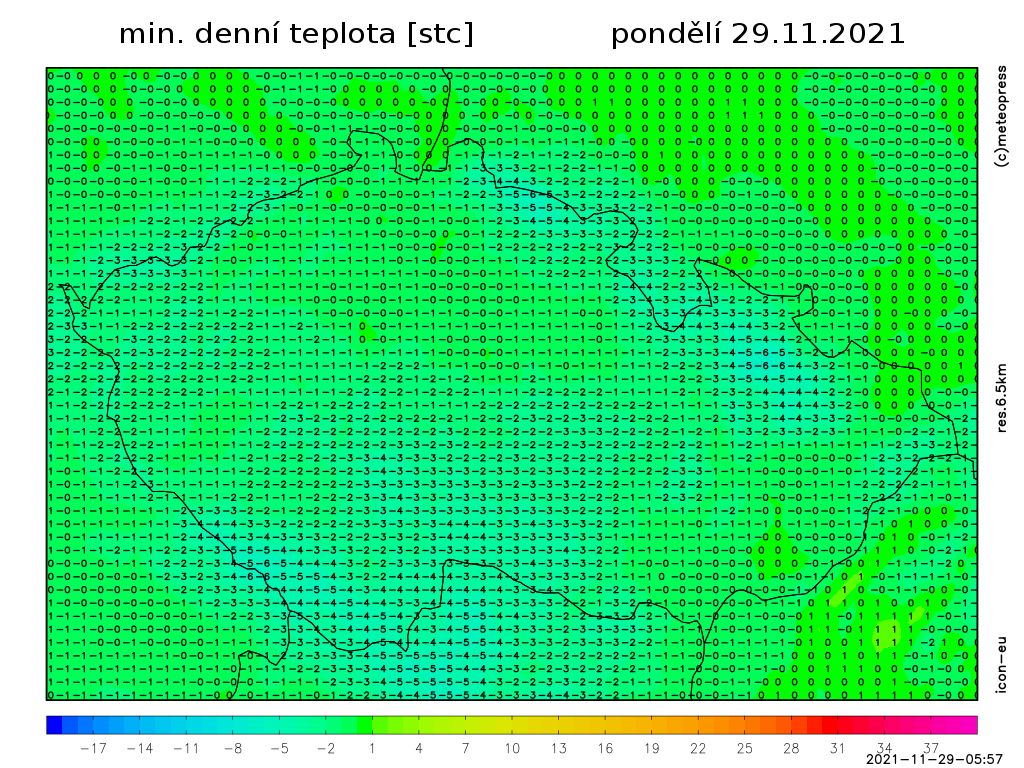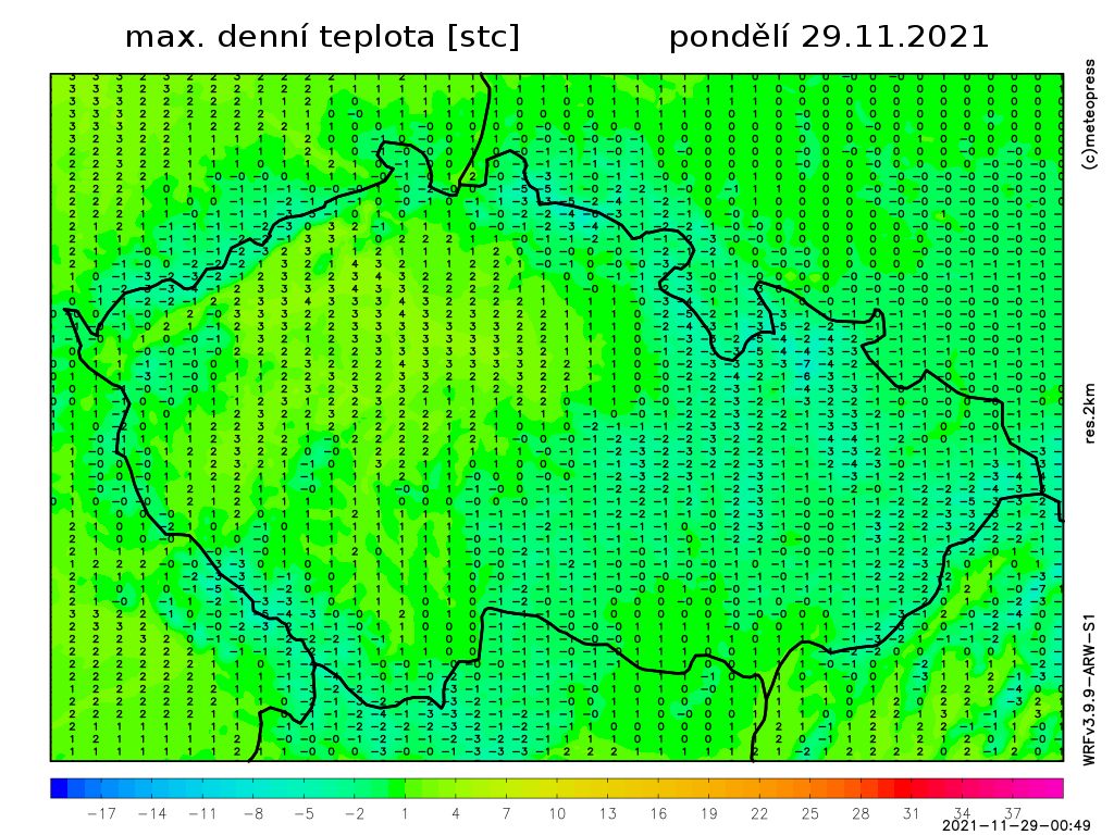 Nejvyšší teploty -1 až 3 °C. Teplota v 1000 m na horách kolem -4 °C. Vát bude slabý až mírný severozápadní vítr.
