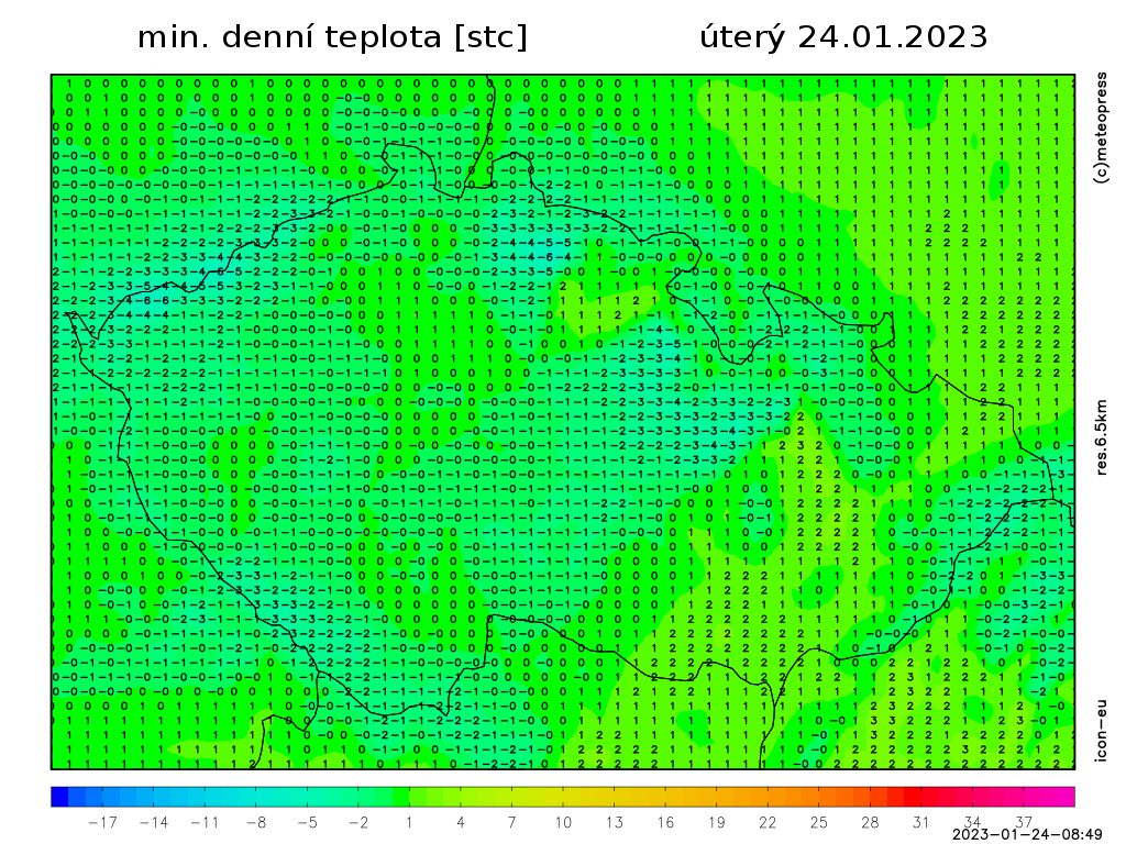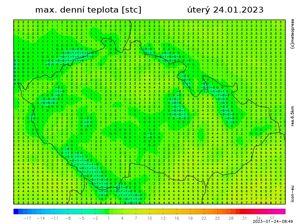 Nejvyšší denní teploty -1 až 3 °C, na jihovýchodě až 5 °C. Teplota v 1000 m na horách kolem 1 °C, na Šumavě kolem -2 °C. Slabý, na východě až mírný severovýchodní vítr.