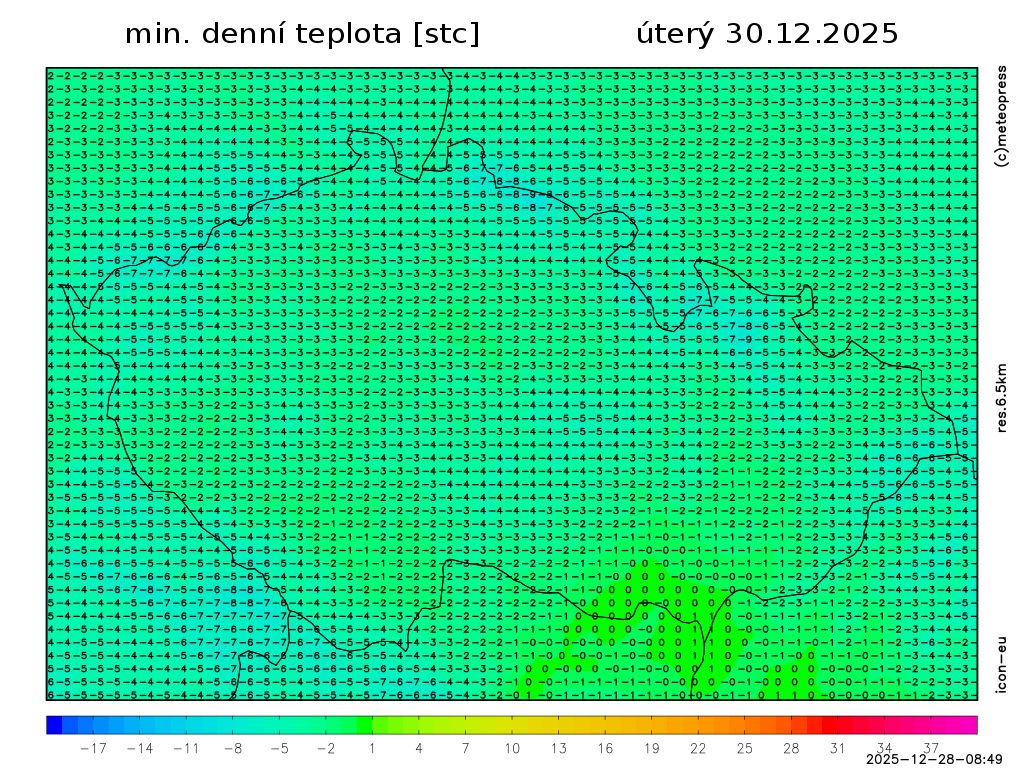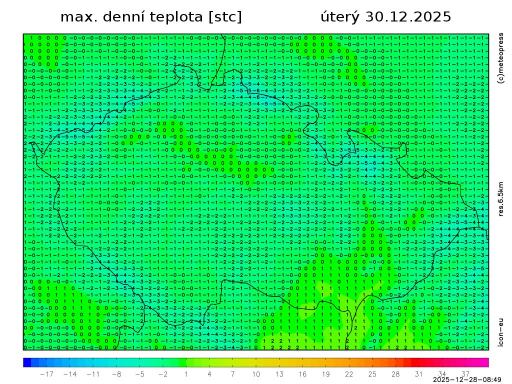Nejvyšší denní teploty vystoupí na -3 až 1 °C. Teplota v 1000 m na horách kolem -6 °C. Mírný až čerstvý severozápadní vítr.