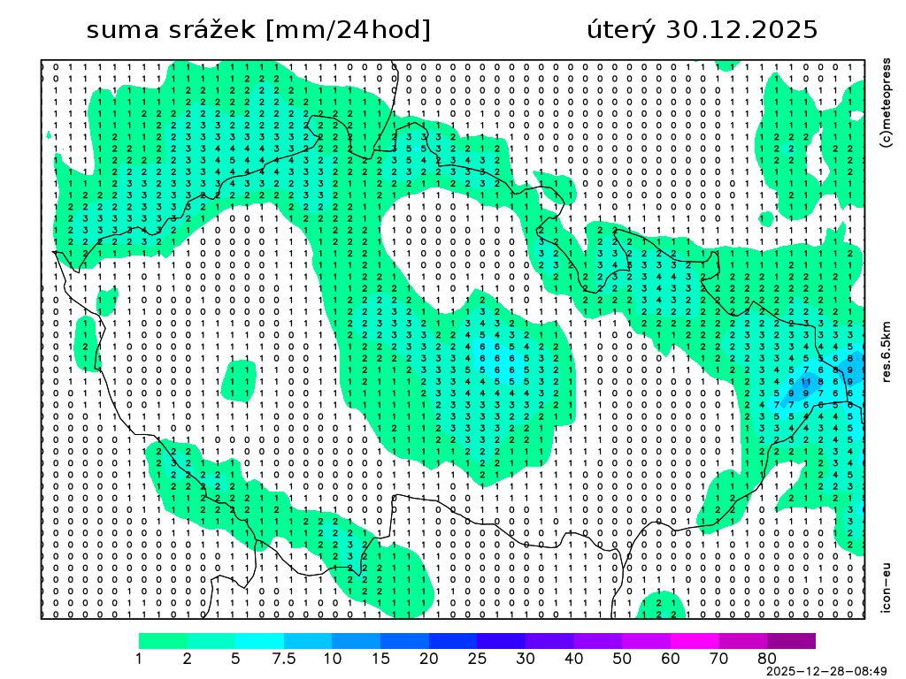 V úterý bude polojasno až oblačno, zprvu místy sněžení, později během dne ojediněle sněhové přeháňky