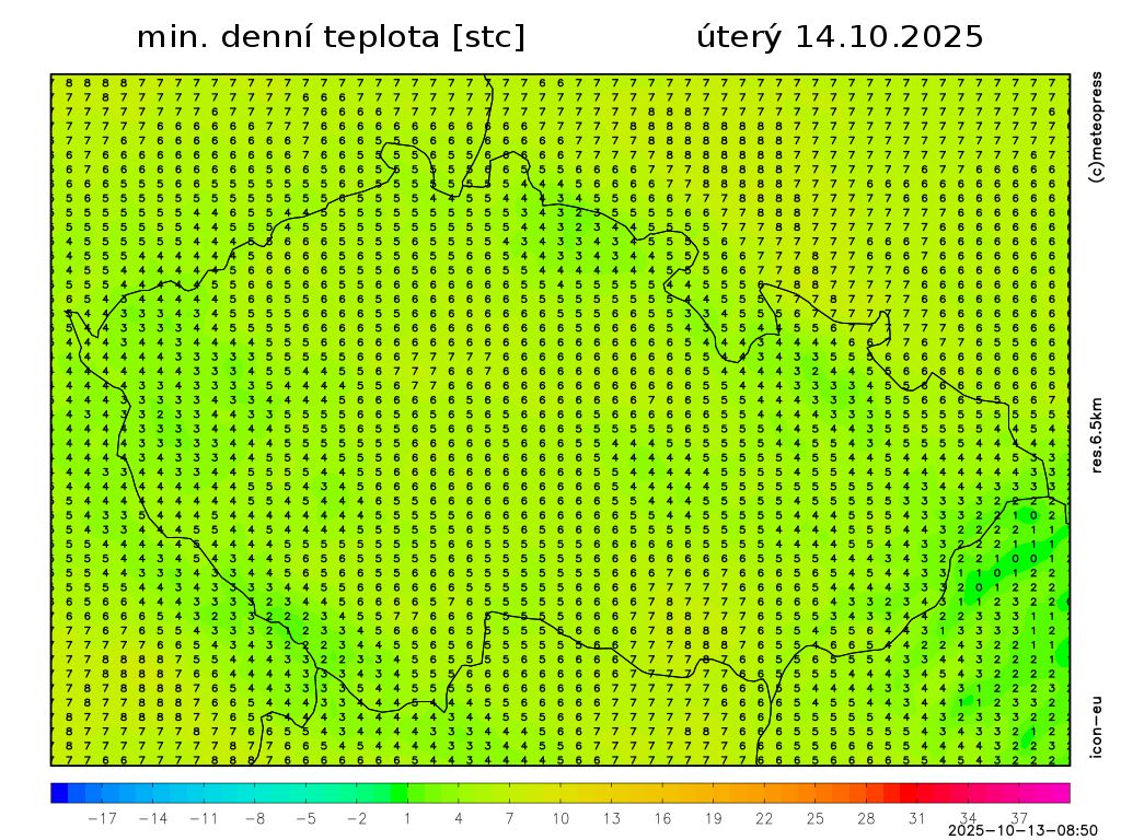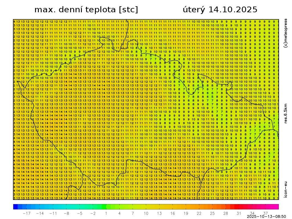 Nejvyšší denní teploty 9 až 14 °C. Teplota v 1000 m na horách kolem 6 °C. Foukat bude slabý vítr severních směrů.
