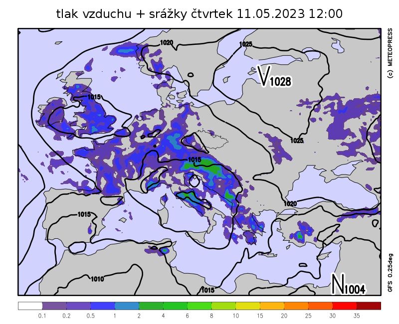 Nad střední Evropou se bude rozpadat okluzní fronta, která ustoupí zpět do Německa a srážky se tak vyskytnou jen v západních a jihozápadních Čechách. Počasí bude podobné tomu středečnímu. Teploty kolem 18 °C, na západě a jihozápadě chladněji. Oblačnosti bude na zbytku území sice více, ale srážky neočekáváme.