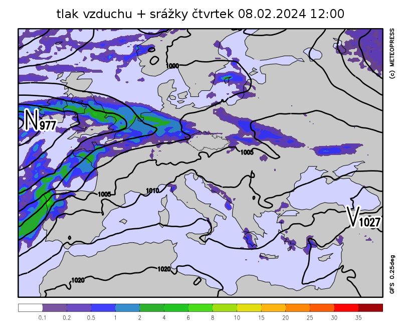 Počasí ve střední Evropě ovlivní frontální rozhraní oddělující studený vzduch na severu a teplý na jihu, které během čtvrtka postoupí dále k severu. Postupně se naše území bude nacházet na přední straně oblasti nízkého tlaku vzduchu nad severozápadní Evropou v teplém jižním proudění.