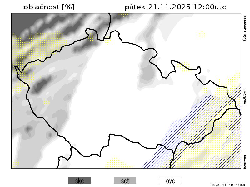 V pátek bude většinou oblačno, místy mlhy nebo nízká oblačnost. Na východě ještě občasné sněžení, v nížinách déšť se sněhem.