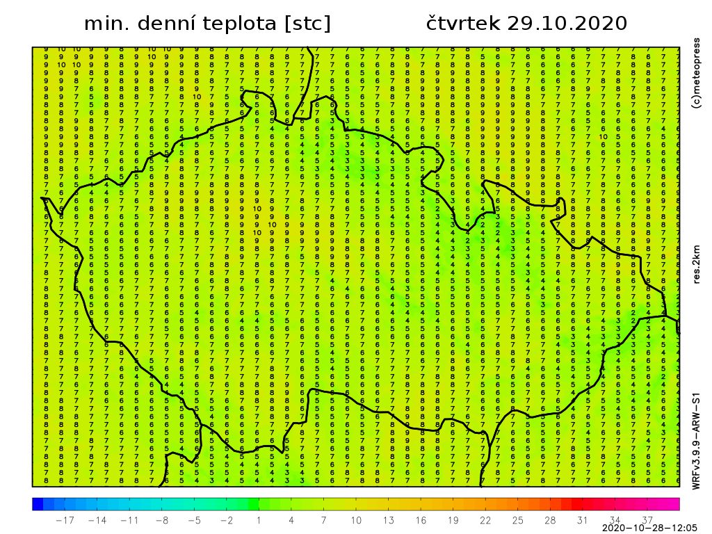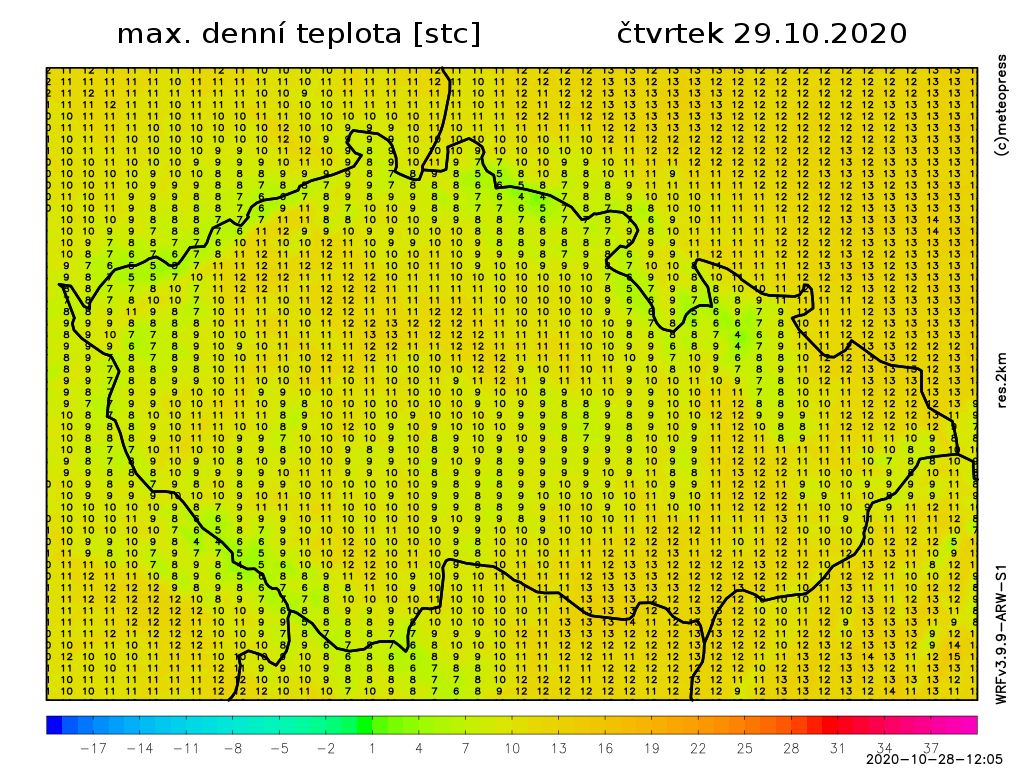 Nejvyšší denní teploty 8 až 12 °C, na jihovýchodě až 14 °C. Teplota v 1000 m na horách kolem 6 °C.