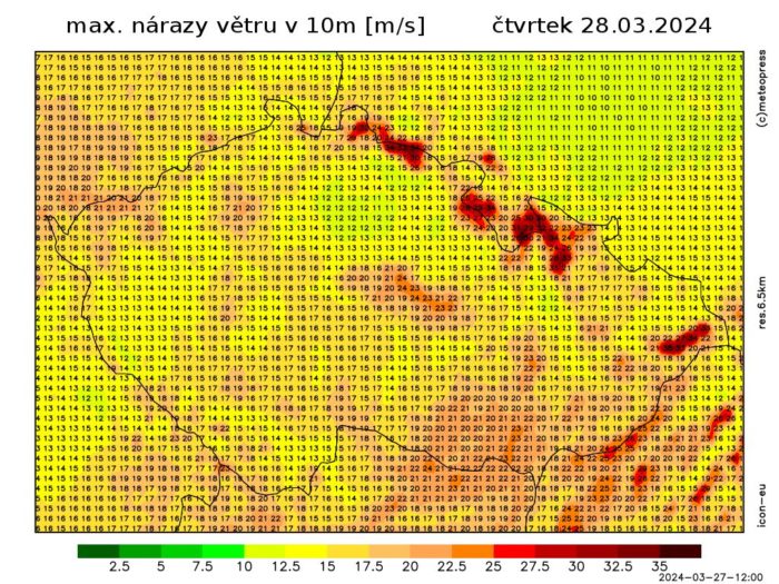 Foukat bude mírný jižní až jihozápadní, na studené frontě přechodně čerstvý západní až severozápadní vítr s nárazy až 70 km/h.