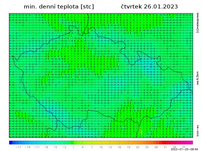 Bude převážně zataženo, místy slabé sněžení. Na horách místy polojasno. Ranní teploty 1 až -3 °C.