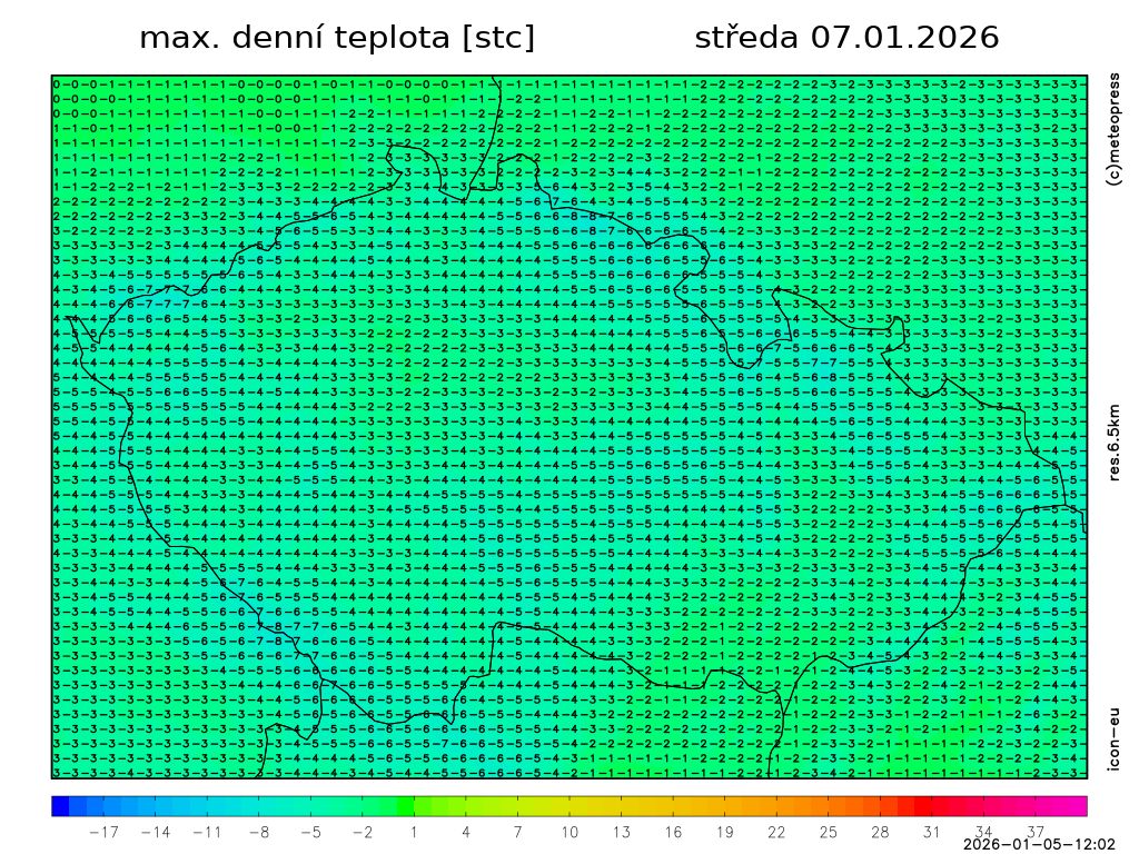Nejvyšší denní teploty -6 až -2 °C. Slabý až mírný jihozápadní vítr.