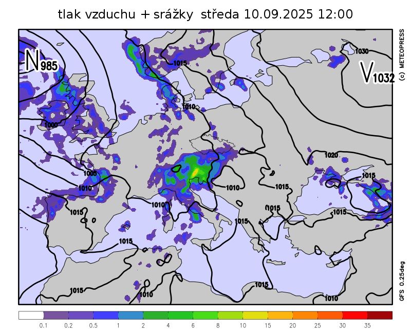 Počasí ve střední Evropě ovlivní brázda nízkého tlaku vzduchu od jihu.