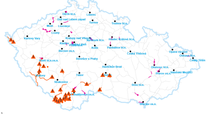 14:25 Hlavně ve východní polovině Čech přibylo úseků železnic, kde je přerušen provoz. Tyto úseky jsou na přiložené mapě znázorněny výstražnými trojúhelníky.