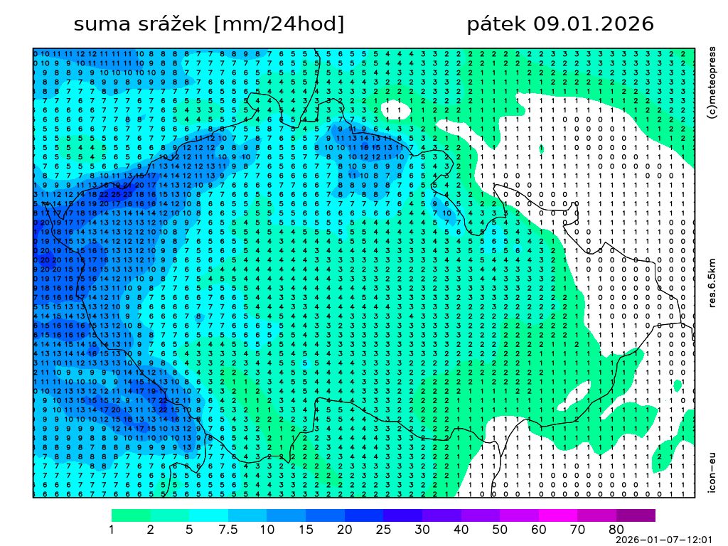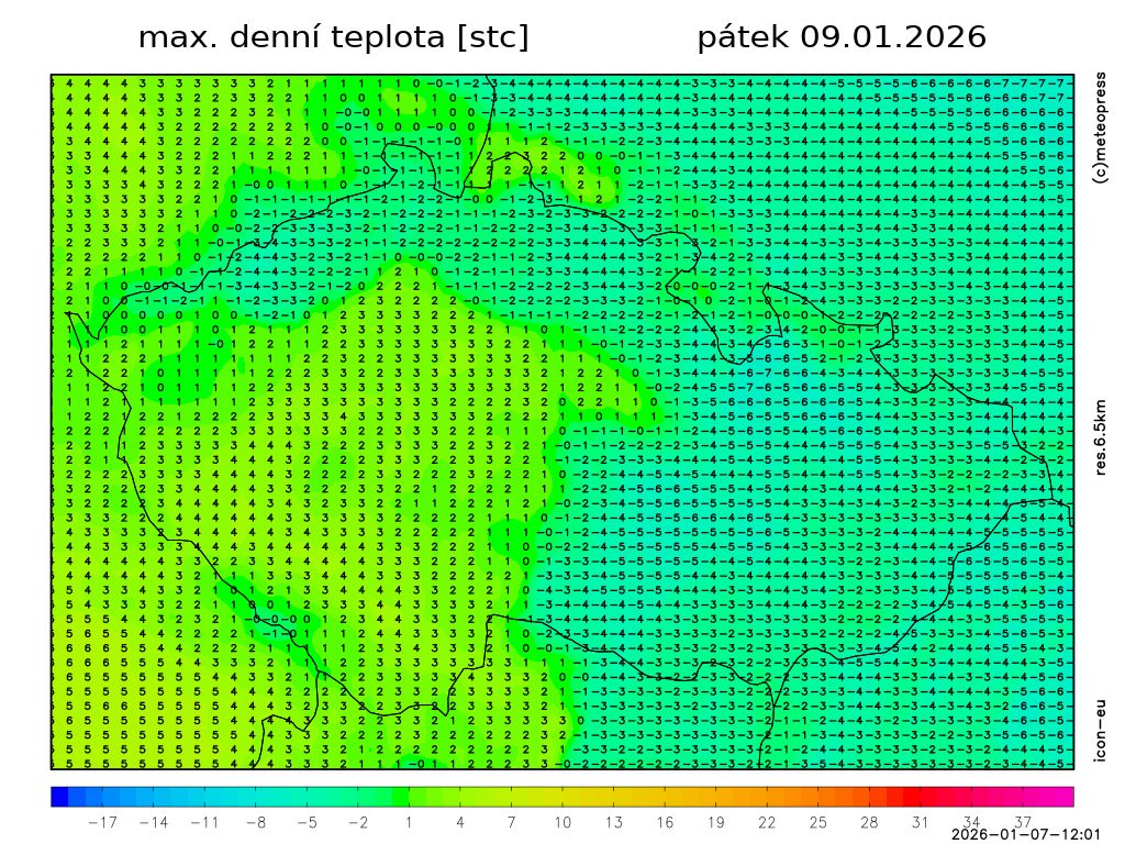 Nejvyšší denní teploty -5 až -1 °C, v jižních a středních Čechách místy kolem 3 °C. Teplota v 1000 m na horách kolem -5 °C, na Šumavě okolo -1 °C. Mírný až čerstvý vítr jižních směrů.