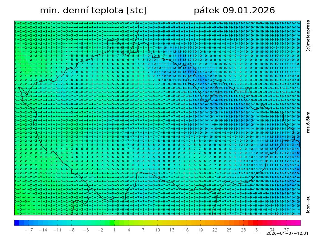 Ranní teploty -3 až -7 °C, na východě až -11 °C.