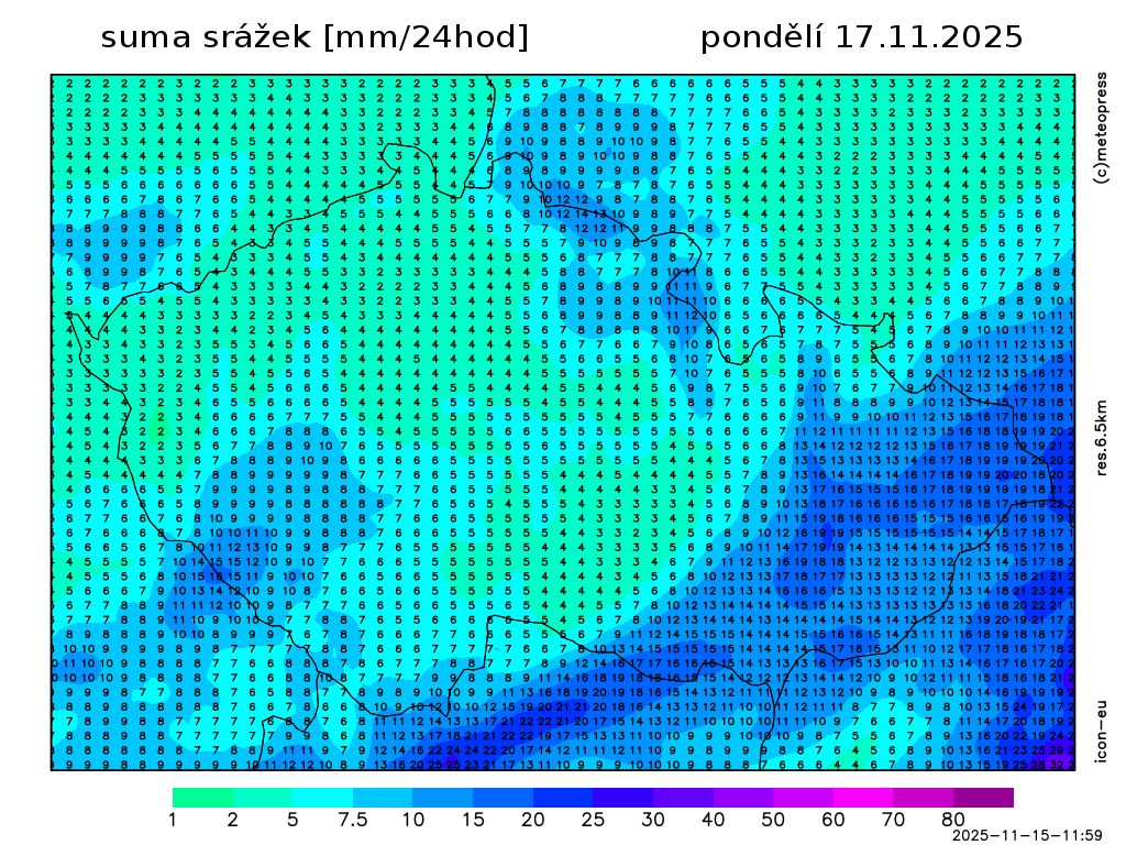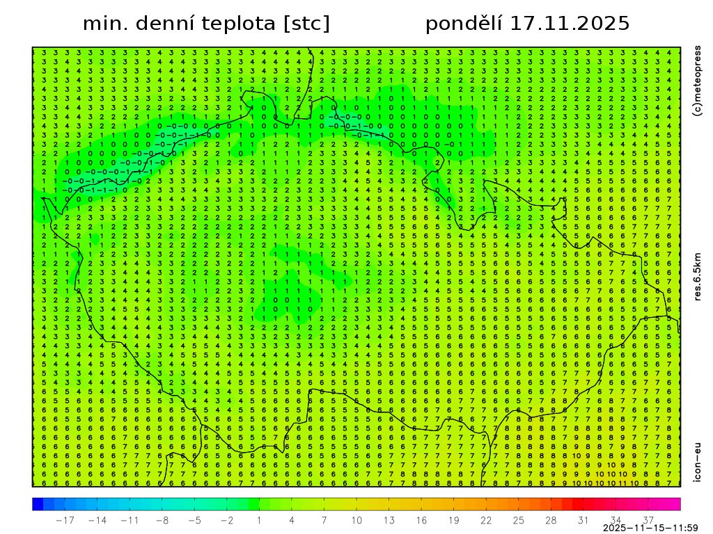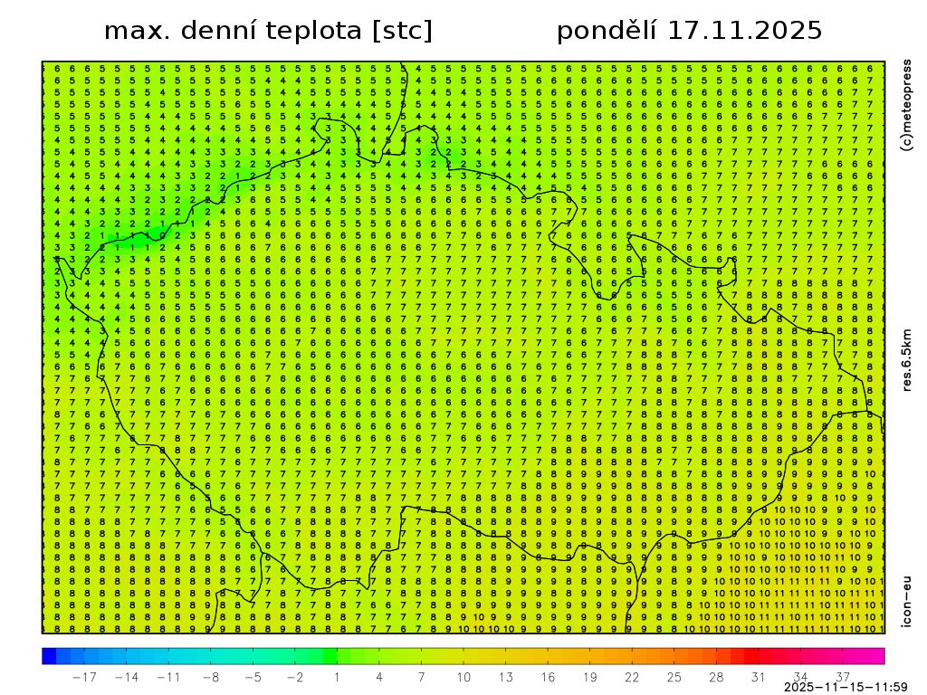 Nejvyšší denní teploty vystoupí na 2 až 6 °C, na východě ještě zprvu naměříme okolo 9 °C. Teplota v 1000 m na horách kolem 0 °C. Slabý až mírný severozápadní vítr.