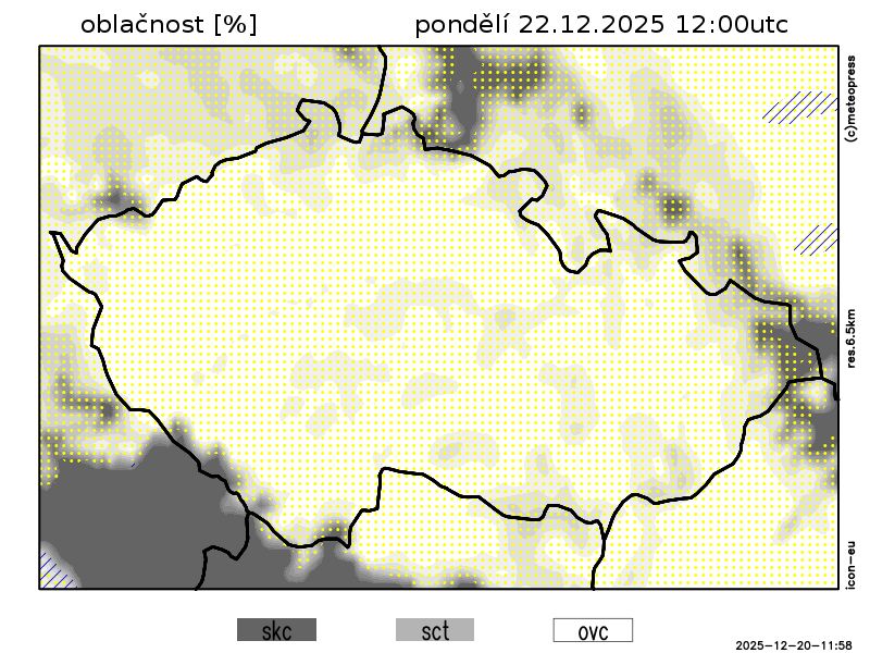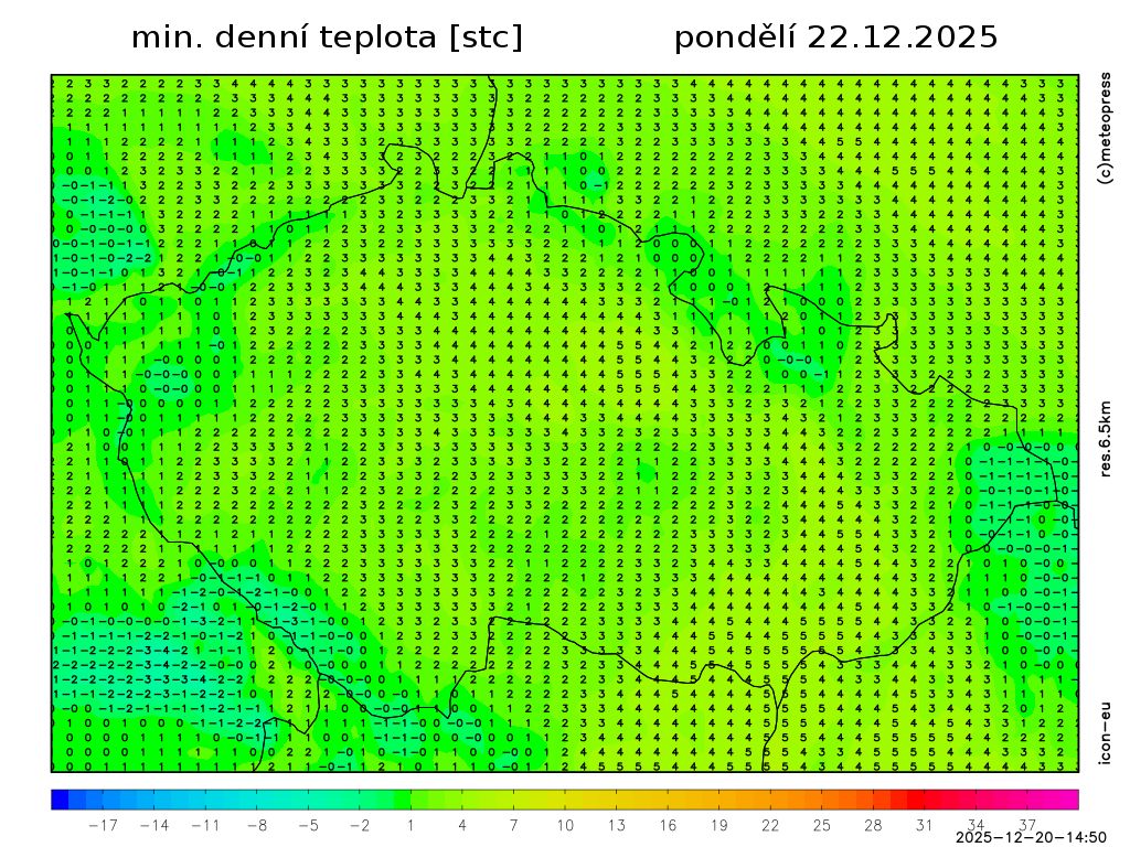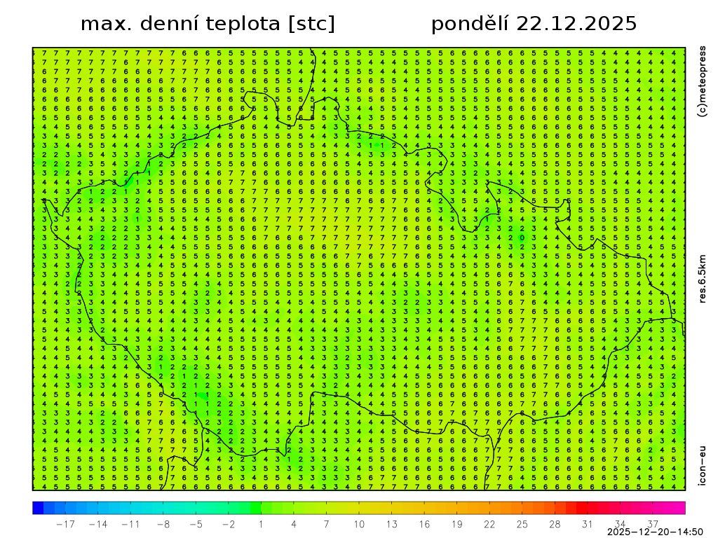 Nejvyšší denní teploty vystoupí na 2 až 6 °C. Teplota v 1000 m na horách kolem 5 °C. Foukat bude slabý až mírný jihovýchodní vítr.