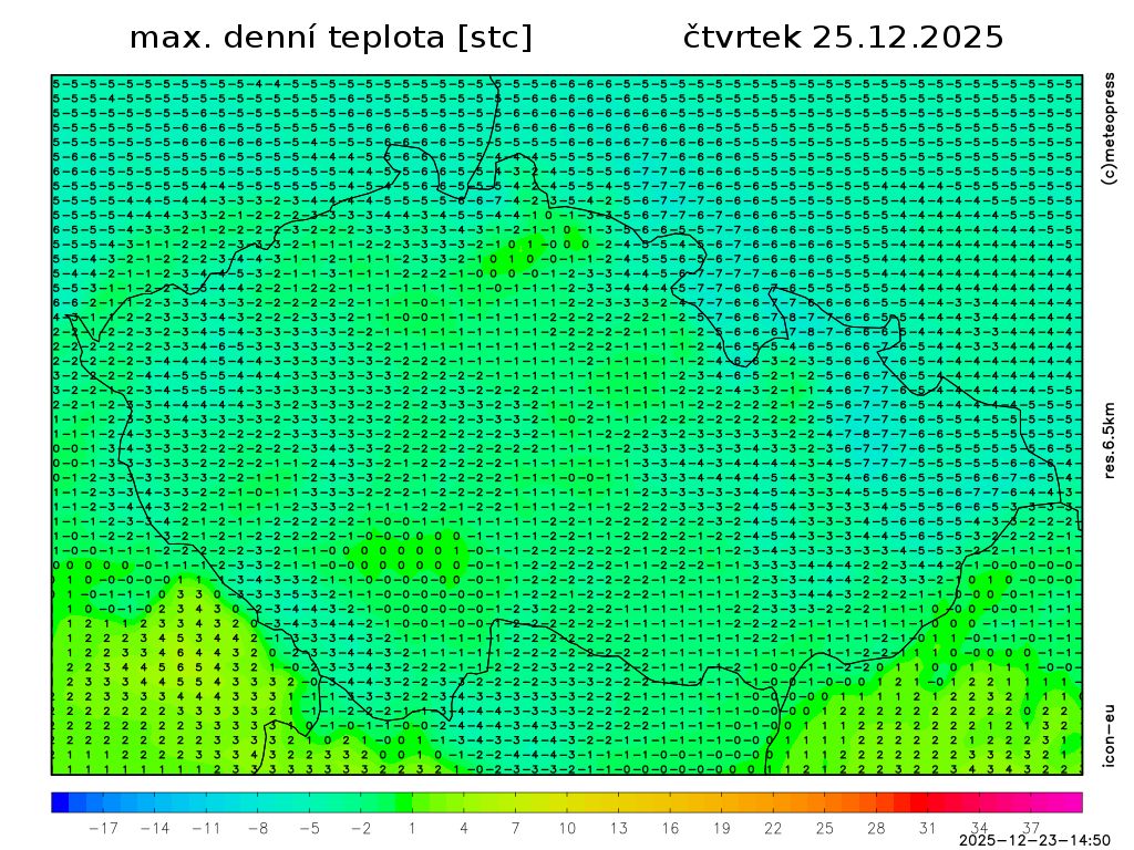 Nejvyšší denní teploty vystoupí na -4 až 0 °C. Teplota v 1000 m na horých kolem -7 °C.