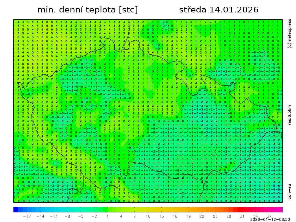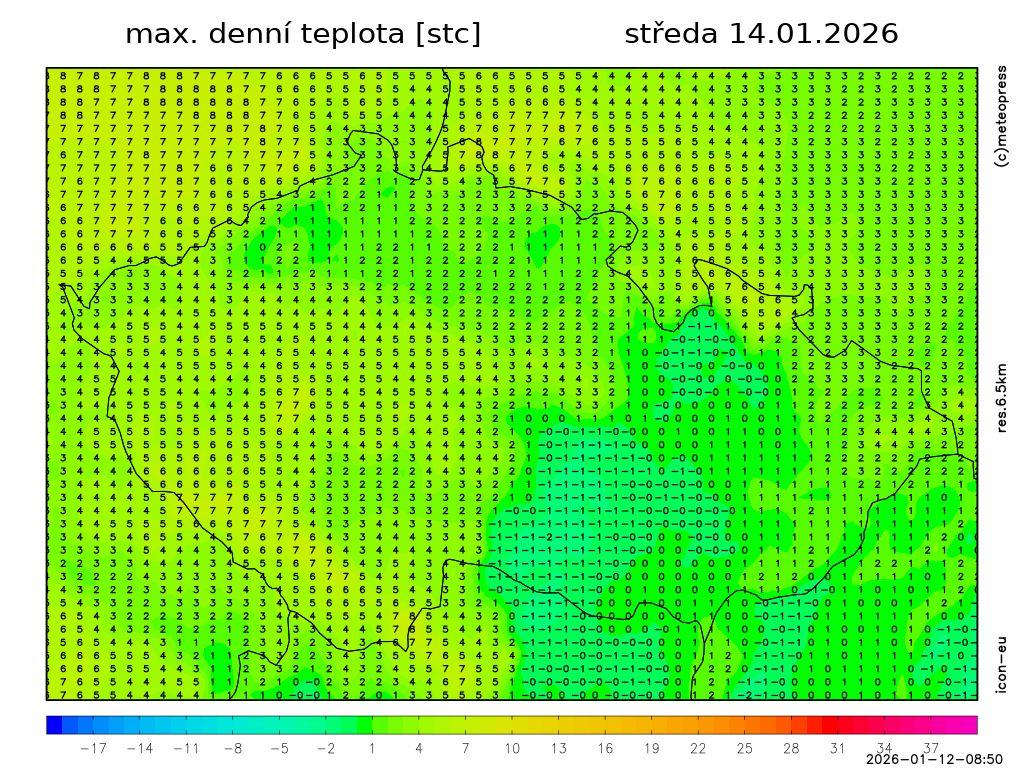 Nejvyšší denní teploty 0 až 5 °C, na jihozápadě až 7 °C. Foukat bude mírný vítr jižních směrů.