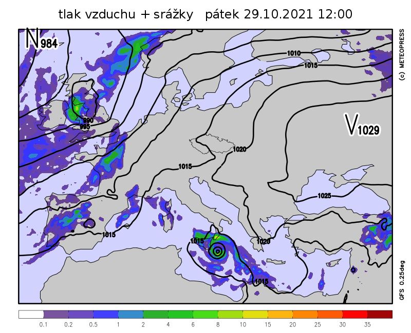 Výstup modelu GFS s vyznačením tlakového pole pro pátek 29. 10. 2021