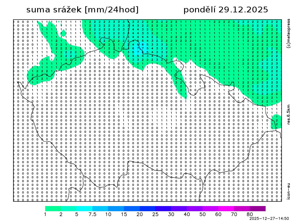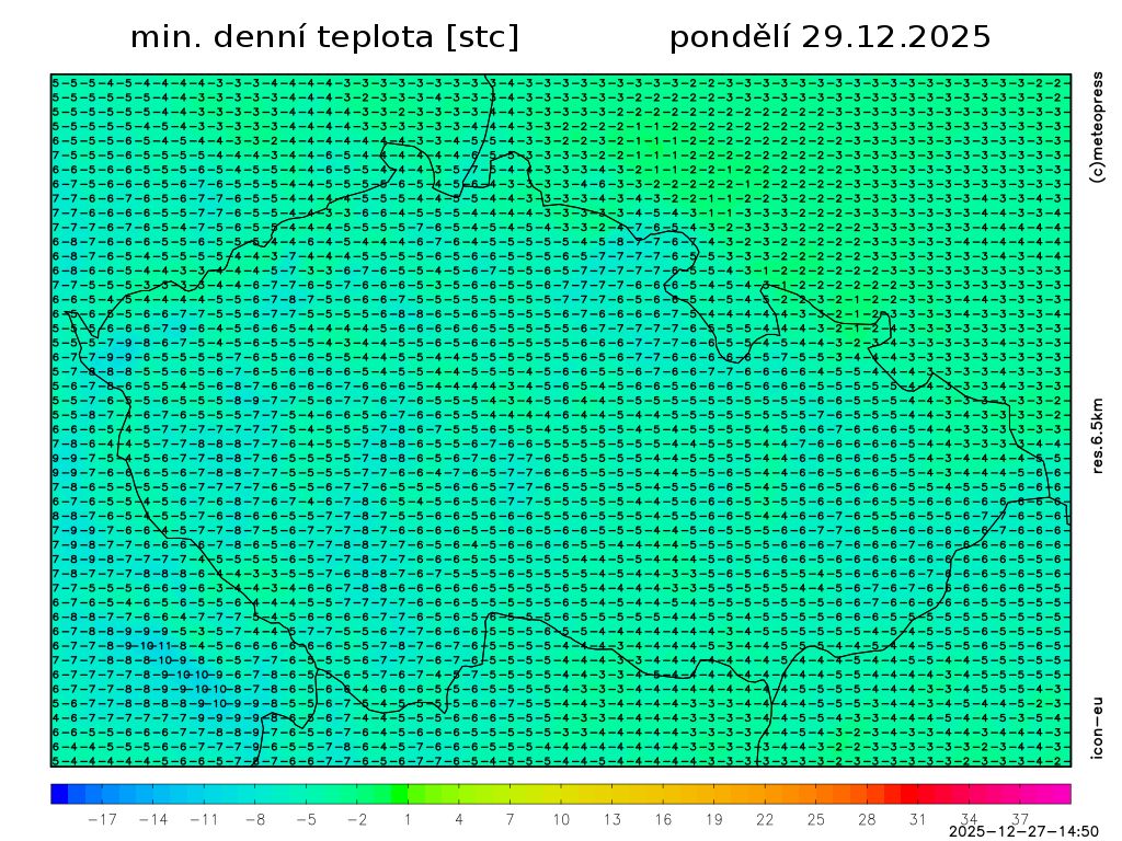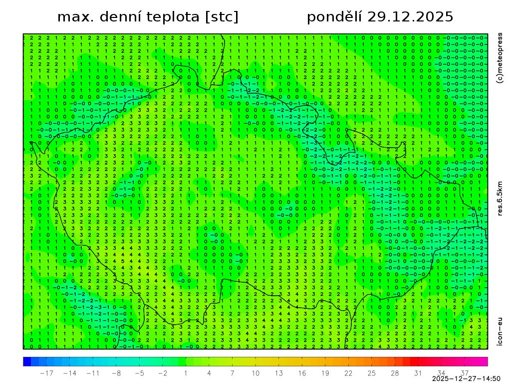 Nejvyšší denní teploty vystoupí -1 až 3 °C. Teplota v 1000 m na horách kolem -3 °C, na Šumavě 2 °C. Foukat bude mírný vítr západních směrů.